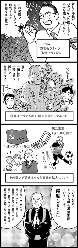1932年生まれ。京セラ、KDDIの創業者。事業活動だけでなく、国際的な顕彰事業「京都賞」や若手経営者を育成する「盛和塾」の創設に財界での活動など幅広い分野で活躍。65歳で得度して僧侶になったという異色の実業家。