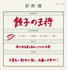今回、本誌取材班が大口駅前店(横浜市神奈川区)を訪れた際、王将の柔軟性を象徴する出来事に出くわした。同店はJR大口駅に隣接し、すぐ前はロータリー。タクシーが客待ちの列をなす中、1羽のカラスが元気なくうずくまっていた。心配した1人のタクシー運転手、開店1時間前の大口駅前店に近寄り、「カラスにやるから、生の餃子ちょうだい。1個だけ」と無茶を言う。餃子の販売は通常6個単位(関東圏231円)、しかも開店前だ。ところが店長らしき従業員、「生餃子1個、38円です」とにこやかに即答! こんな弾力性に富んだ見事な対応が、他のチェーンで可能だろうか?そんな大手レストランチェーンらしからぬ魅力に溢れる王将。店舗によってどれほどの違いがあるか、非常に気になる。そこで今回、各店舗の味や価格、オリジナリティなどを独自にチェックしてみた。その一部を、次ページ以降でバトル形式で紹介するとともに、最終的には、全国535店舗の頂点に立つ"最強店舗"を勝手に認定!調査対象がごく一部(約20店舗)にすぎない点については、シャレ企画ゆえにどうか大目に見ていただきたい。
