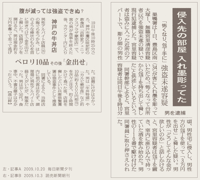 それに比べれば、【記事A】の男の2時間なんて大したことないが、食べた量がちょっとすごい。「『牛丼特盛』や『カルビ焼定食』など約10品(約4000円相当)を次々と注文」って、ギャル曽根じゃあるまいし。しかも、それだけ食べた後、おもむろに店員を脅してレジの金を奪い、走って逃げたというんだから驚きだ。