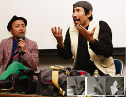 いつもの通り、身振り手振りを交えて熱弁する渡部さん。マキタスポーツさんも圧倒されまくりだった。右下の写真が「渡部陽一の戦場取材用裏アイテム」。左から、スキットル、香水、スクリーンプレイ。(写真/名和真紀子)
