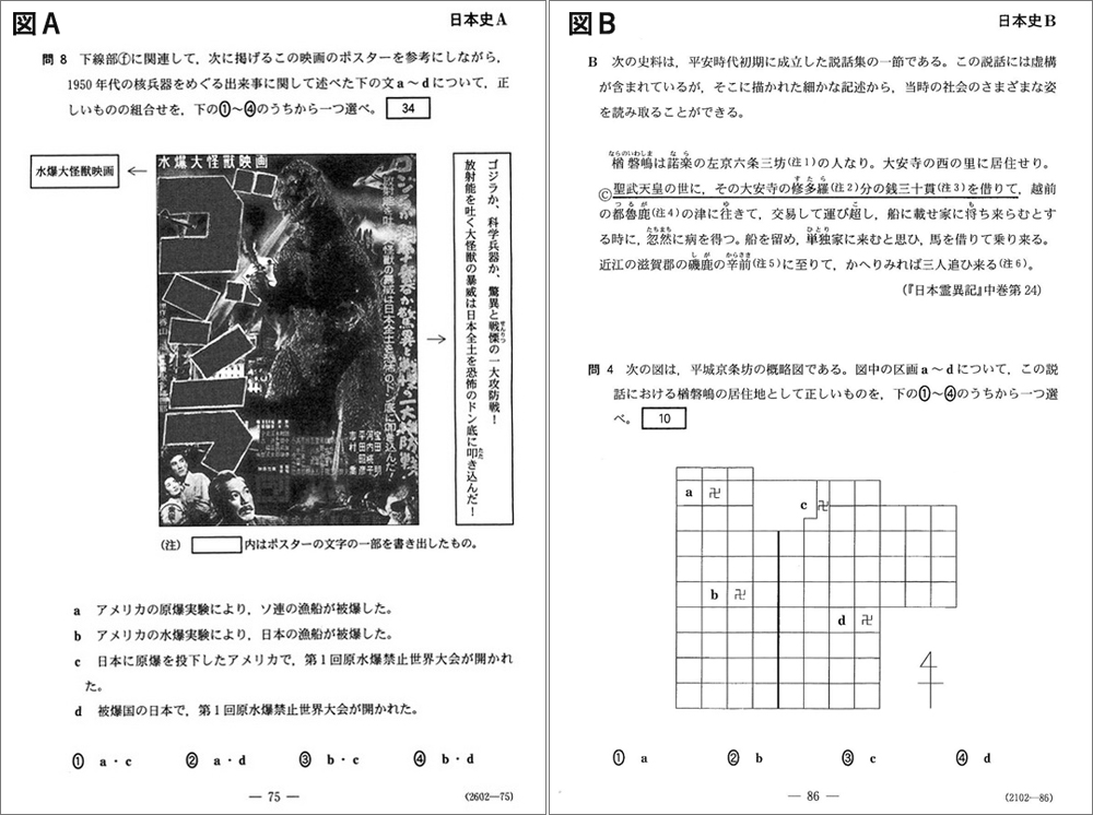 図Aは、11年度のセンター試験「日本史A」の問題より。「センター試験にゴジラが登場!」と話題になった。図Bは、08年度のセンター試験「日本史B」の問題より。歴史の知識のみならず、古文の知識も要求される。