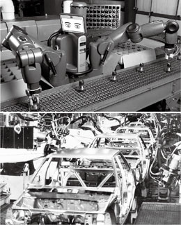 新ロボット・バクスターは顔状のインターフェースが特徴(上)。かつて工業ロボットといえば巨大なプロダクトのためにあったものだが……(下)。
