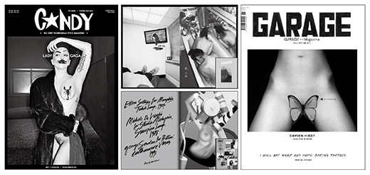 [左]「CANDY」(Candy/09年創刊/43ポンド)の最新号は、アソコを露出した男装のガガ様の表紙が話題に。[中央上]「BARON」(Baron/09年創刊/30ポンド)の最新号は写真のみ。ポルノにも見えるヌードが多く、危ないイメージばかり。1000部限定。[中央下]「TALC」(Talc/13年創刊/8ポンド)はデザインとポルノをテーマにした雑誌。女性の裸体をオブジェ化したイメージがおもしろい。2000部限定。[右]「GARAGE」創刊号の表紙はデミアン・ハーストが手がけた。写真はエディ・スリマンが撮影。