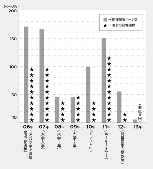 昨年、斎藤は右肩の故障によってシーズンの大半を二軍で過ごし、メディアに取り上げられる機会も激減した。活躍していないのだから仕方ない。しかし野球ファンからしてみれば、「これまでさんざん持ち上げてきたくせに……」とメディアの節操のなさに疑問を感じてしまう。そもそもスポーツメディアは、果たして彼をフェアに扱ってきただろうか? ここでは、そんな疑問を胸に、彼をめぐるスポーツ専門誌の記事を振り返りながら、「斎藤佑樹の報じられ方」を追ってみたい。