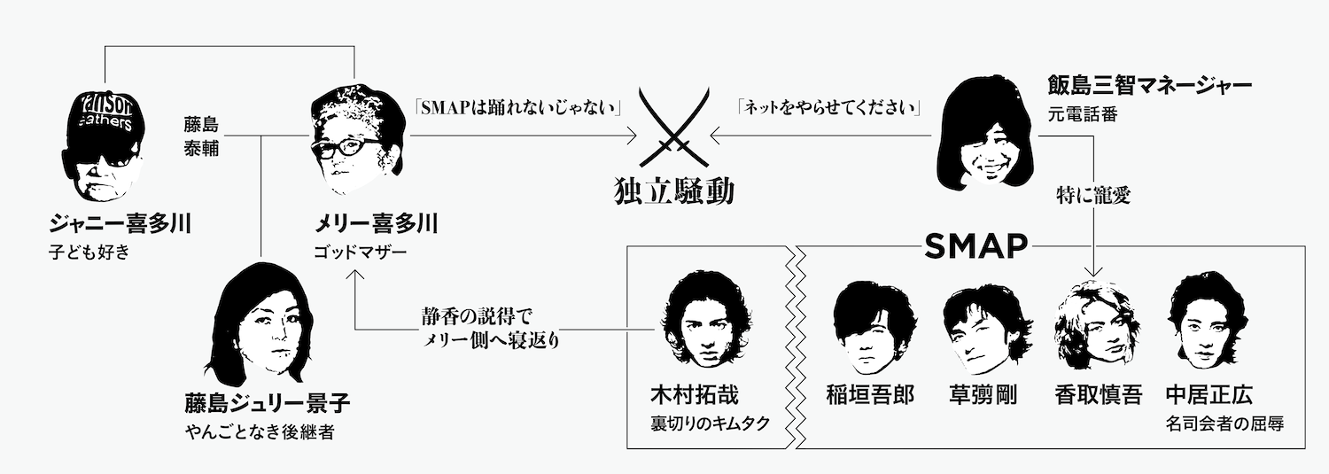 ジャニーズ全盛を迎えるきっかけをつくった5人衆(中居、稲垣、草彅、香取、木村)が4対1に分裂し、木村以外の4人が独立を企てたことが明るみとなり、2016年「SMAPの乱」の火蓋が切って落とされる。4人を陰で指揮したのはジャニーズの重臣、足軽から成り上がった飯島三智女史。女史はさまざまな身分からなる強力な一派を独自に編成するも、彼女の一連の行動がジャニーの姉・メリー喜多川の逆鱗に触れ、メリーは「文春文書」を全国に発布、飯島を断罪した。ここでメリーは、我が娘・ジュリーが2代目であることを高らかに宣言、責めを負わされた飯島は行方知れずに。5人衆は屈辱の謝罪会見を受け入れ、ジャニーズに戻されることとあいなった。