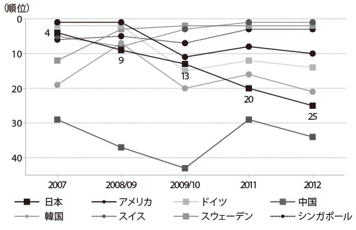 イノベーションに関する国際競争力ランキングの推移(出典:産業競争力会議(第2回)山本大臣提出資料)