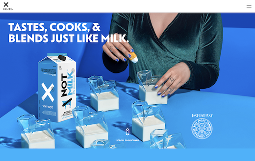 しかし、赤と白を使ってデザインされたおしゃれなパッケージを見ると、実はこれはミルクではないことがわかる。商品名は『NotMilk』(ミルクじゃない)。乳牛のシルエットに、大きなバッテンがつけられたデザインになっている。実はこれ、チリで生まれたいま話題の食品スタートアップ、ノットコ(NotCo)が約半年前にアメリカで売り出して、話題になっている植物性ミルクのひとつだ。