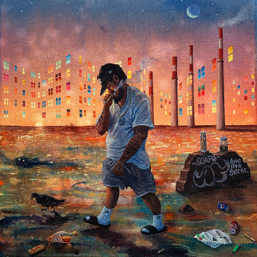 その後、絵ができたっていうからShuto君のアトリエに行ったんだけど、そこでいろいろ話してたら、村上隆さんの有名な《五百羅漢図》っていう全部違うキャラクターのお坊さんが描かれたすごくデカい絵を手伝った人だとわかったんだよね。で、完成したジャケットの絵を見せてもらうと、自分の住んでるところの近くにいっぱいあるプロジェクトビルディング(低所得者団地)とか、クイーンズのシンボルの煙突とか、そういう風景が描かれていて、細かいところには自分のスローアップ(2色の文字のグラフィティ)が入ってたり、RAWペーパーとかブラントとかヘネシーとかが落っこちてたり。つまり、絵の中にリアルなものがあるんだけど、それが幻想的に表現されていてね。リアルと、想像の中のリアルの2つがあるというか。それと、月がすごく綺麗で、昼と夜の境目が美しい色合いで描かれていた。自分みたいなヤツをそうやって神秘的に表現してもらって、彼はマジで素晴らしいアーティスト! Shuto君、本当にありがとう!