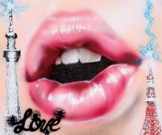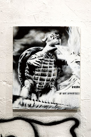 DJ DARUMA(以下、D) ぶっちゃけ、Daimonくんのこと全然知らなくて(笑)。今年、目黒にある「ギャラリー月極」に行ったときにトイレを借りたんですけど、2階の事務所にスプレーで直接絵が描かれたソファがあったんですよ。すごいクールだなと思って、ギャラリーの友達に「これ何?」って聞いて、「Ryota Daimonくんが描いたんだよ」って教えてもらったことがきっかけだったんです。そこでインスタのアカウントを教えてもらい、メンションを付けてストーリーズにアップしたのかな。そしたら「今度エキシビションをやるので遊びに来てください」とDMが届いて。
