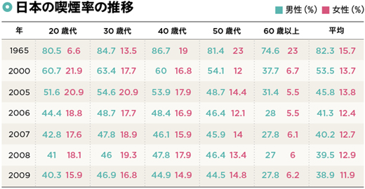 JT全国喫煙率調査より。1965年以降、減少を続けており、2011年現在での男女合計の喫煙率は約21%。なお主要な先進国ではロシアが43.4%と最も高く、フランス24.7%、ドイツ23.0%、アメリカ16.7%となっている(いずれも2010年の数値)。